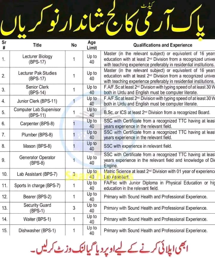 کیڈٹ کالج میں مختلف شعبوں کے لیے ملازمتیں دستیاب ہیں، جن میں تدریس، انتظامیہ، مالیات، سیکیورٹی اور دیگر فیلڈز شامل ہیں۔ درخواست دینے کے لیے ضروری شرائط یہ ہیں:
