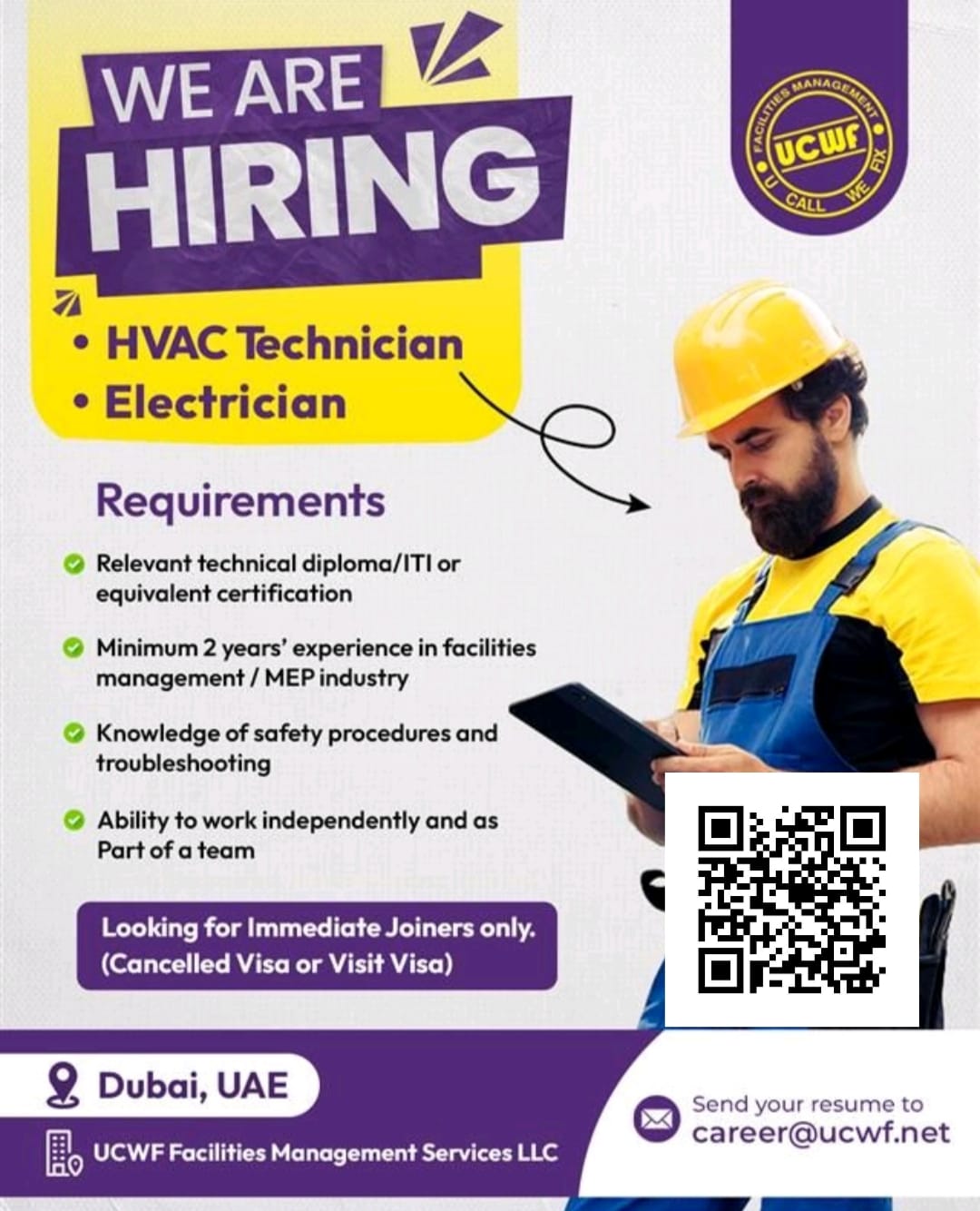 متحدہ عرب امارات میں ہنر مند تکنیکی ماہرین کے لیے ایک بہترین موقع سامنے آیا ہے۔ UCWF Facilities Management Services LLC نے فوری طور پر الیکٹریشن اور HVAC ٹیکنیشنز کی خدمات حاصل کرنے کا اعلان کیا ہے۔ یہ نوکریاں خاص طور پر ان افراد کے لیے ہیں جو سہولت کے انتظام (facilities management) اور MEP (Mechanical, Electrical, and Plumbing) کی صنعت میں تجربہ رکھتے ہیں۔ یہ آپ کی صلاحیتوں کا امتحان ہے۔ کمپنی فوری شمولیت کے لیے امیدواروں کی تلاش میں ہے، جس کا مطلب ہے کہ یہ ایک تیز رفتار بھرتی کا عمل ہے۔ یہ ان تمام افراد کے لیے ایک شاندار موقع ہے جو پہلے سے ہی متحدہ عرب امارات میں موجود ہیں اور ایک مستحکم نوکری کی تلاش میں ہیں۔