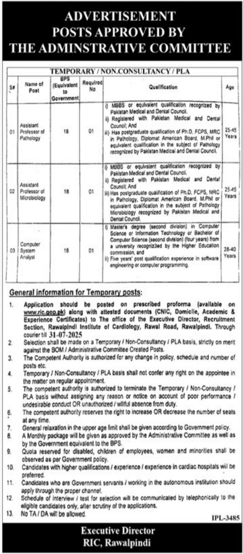The Rawalpindi Institute of Cardiology (RIC), a leading cardiac hospital in Pakistan, is currently hiring for various positions. Established in 2012, RIC is renowned for its high-quality healthcare services and is now seeking dedicated professionals to join its team. Available Positions:
