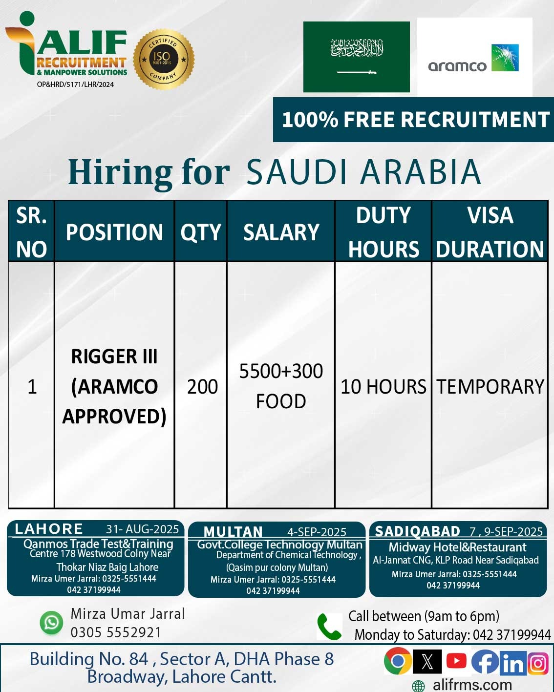 Alif Recruitment, a certified ISO company, is conducting interviews for a major project in Saudi Arabia with Aramco. The company is offering 100% free recruitment with no charges to the candidate.