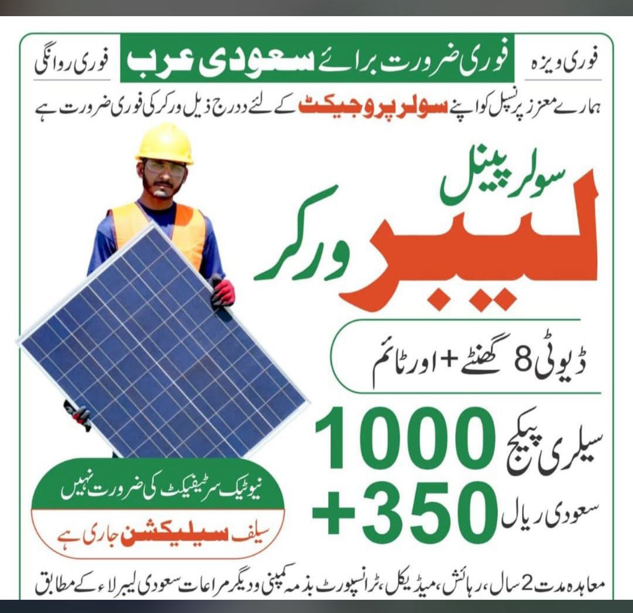 سعودی عرب میں توانائی کے شعبے میں تیزی سے ترقی ہو رہی ہے، خاص طور پر قابل تجدید توانائی میں، جس کی وجہ سے سولر پینل ورکرز کی مانگ میں غیر معمولی اضافہ ہوا ہے۔ یہ ایک شاندار موقع ہے ان محنتی اور باہمت افراد کے لیے جو اپنا مستقبل سنوارنا چاہتے ہیں اور اپنے خاندان کی مالی حالت بہتر بنانا چاہتے ہیں۔ یہ ایک سنہری موقع ہے۔ ہمارے معزز پرنسپل کو اپنے سولر پراجیکٹ کے لیے فوری طور پر تجربہ کار اور قابل محنت کشوں کی ضرورت ہے۔ یہ نوکری نہ صرف ایک اچھی تنخواہ فراہم کرتی ہے بلکہ بیرون ملک کام کرنے کا قیمتی تجربہ اور دیگر بہترین سہولیات بھی پیش کرتی ہے۔ اس اعلان کے ساتھ، فوری ویزا، فوری ضرورت اور فوری روانگی پر زور دیا گیا ہے، جو اس بات کا اشارہ ہے کہ یہ نوکریاں جلد ہی پر کی جائیں گی۔